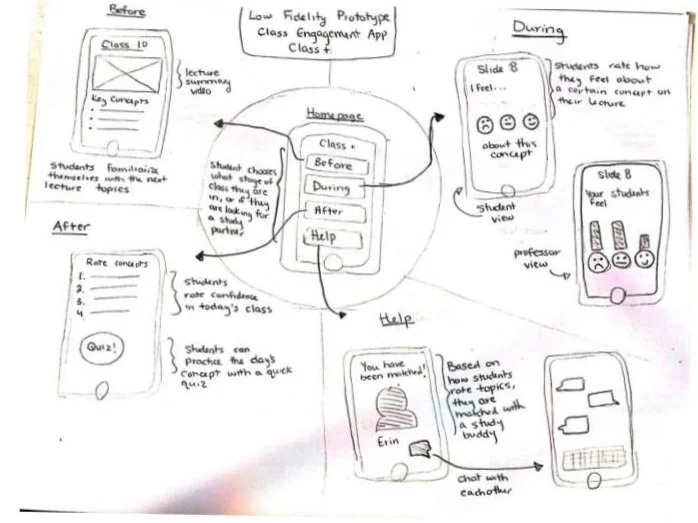 Through our research, we discovered a common pattern of our users feeling disengaged during lectures and in turn not receiving the grades they ultimately want. We sorted our main findings and user frustrations into three main categories; before, during, and after class, as shown below: