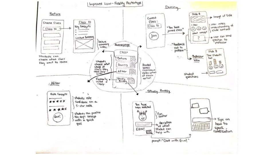 Using the wizard of oz experiment, we tested the before, during, after and study buddy interfaces of the app to see if each page is digestible, understandable, and able to do what the users want it to do. The following is what we changed: