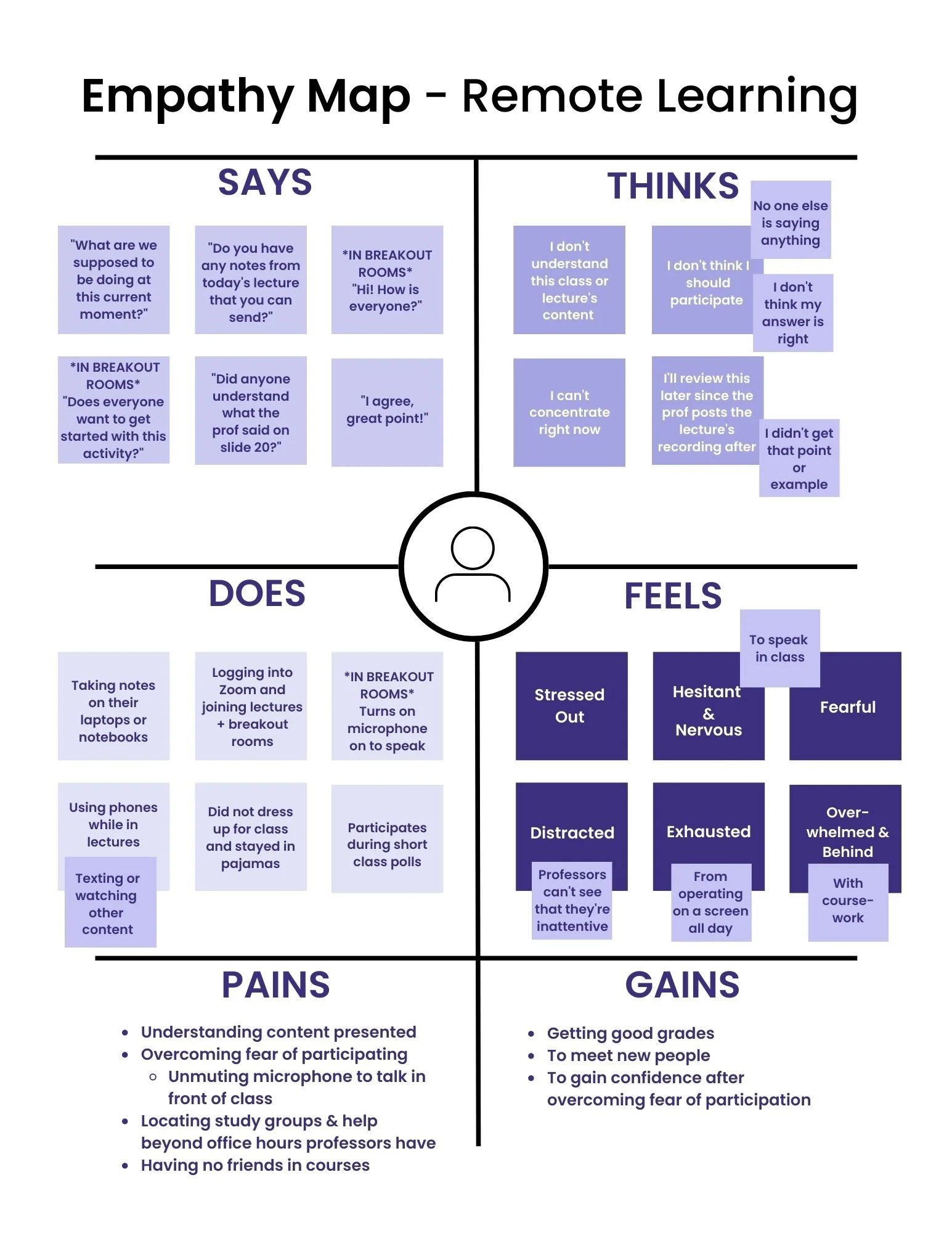 Through the research and data we were able to gather while observing our user during the contextual inquiry, we were able to synthesize a few insights and create a relevant empathy map that expresses what students are thinking, saying, feeling, doing, and their pains and gains.