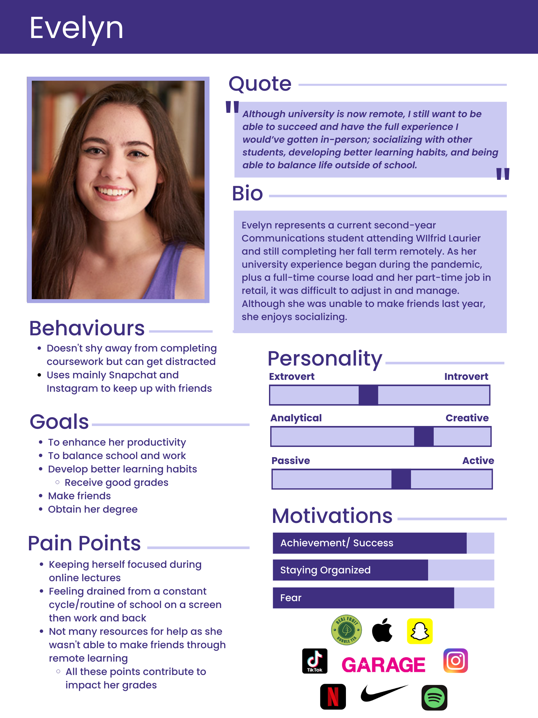 Our team was able to create a relevant persona representing a fictional depiction of our core user that exhibited similar motivations, behaviours, and overall responses that we gathered from our contextual inquiries and user interviews.